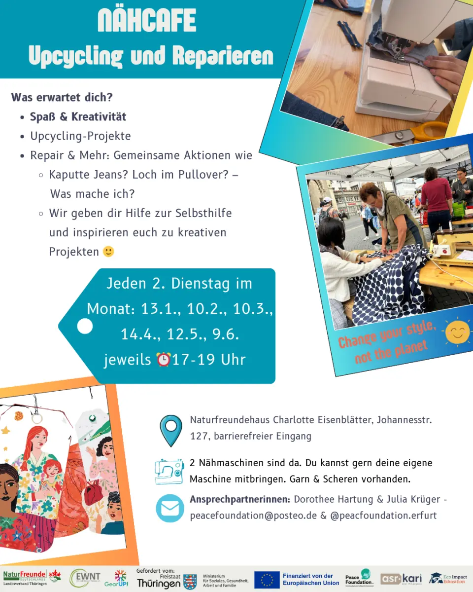 Am 11. November 2025 startete im Naturfreundehaus Erfurt das Nähcafé „Upcycling und Repair“, ein gemeinsames Angebot in Kooperation mit den Naturfreunden Thüringen. Die Veranstaltung fand von 17:00 bis 19:00 Uhr statt und lud dazu ein, Kleidung gemeinsam zu reparieren, kreativ umzugestalten und Wissen rund um nachhaltigen Umgang mit Textilien zu teilen.